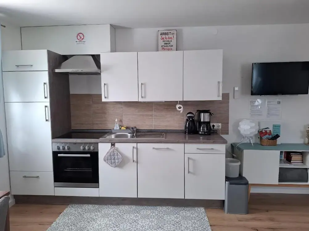 More information about DasSchaffers - MeinWohlfühlhotelUrlaub in der Schwarzrieslingstraße offers a one-bedroom apartment in Bad Mergentheim with a private entrance, a fully equipped kitchenette, and a cozy seating area. Modern amenities include free WiFi, a TV, and a dining area, plus a refrigerator, oven, stovetop, and coffee machine. Additional conveniences are a hairdryer, electric kettle, and kitchenware.