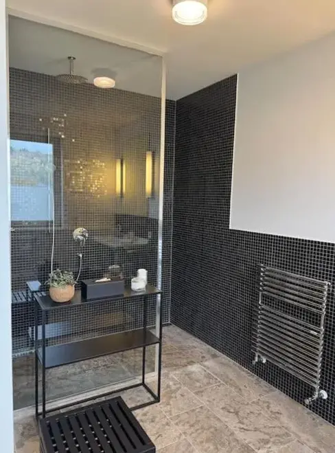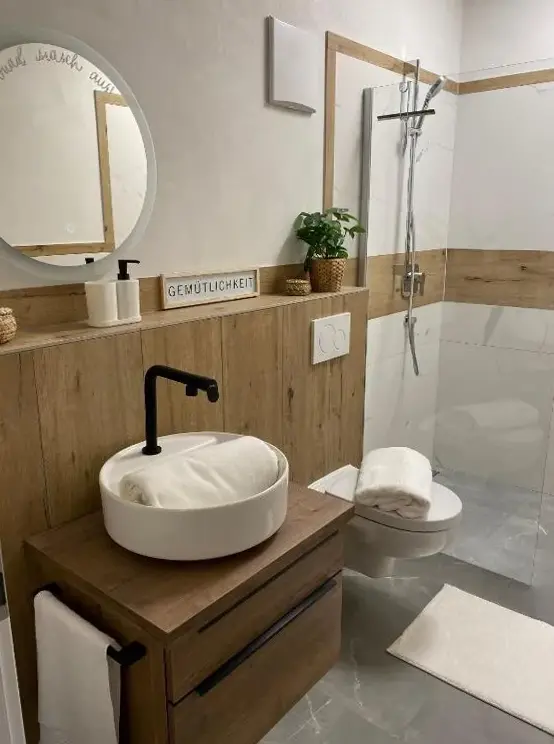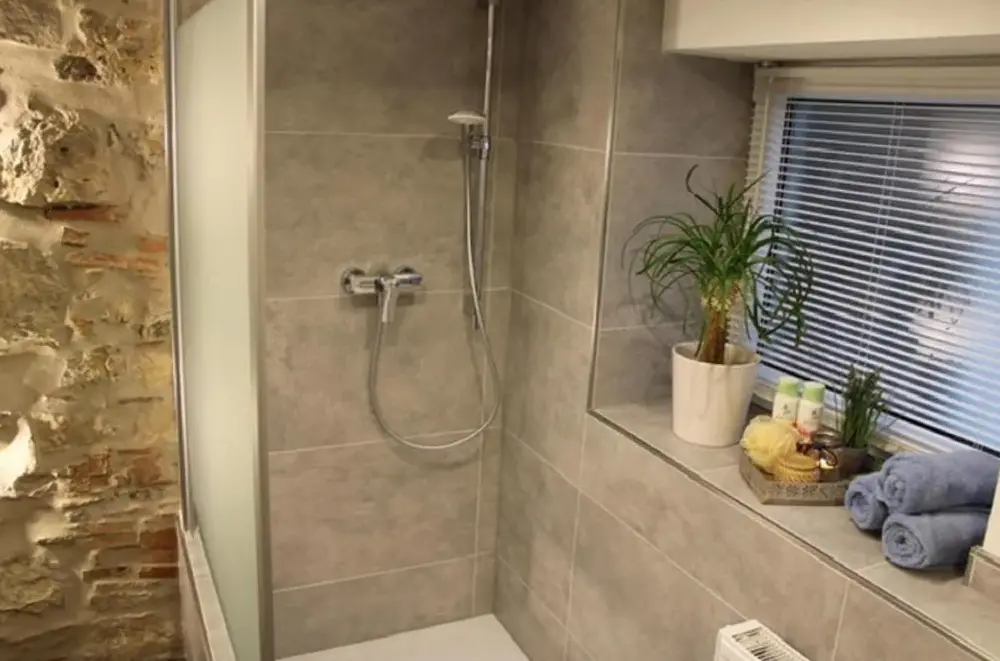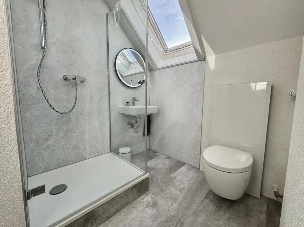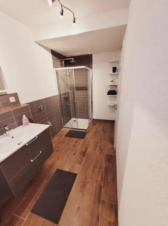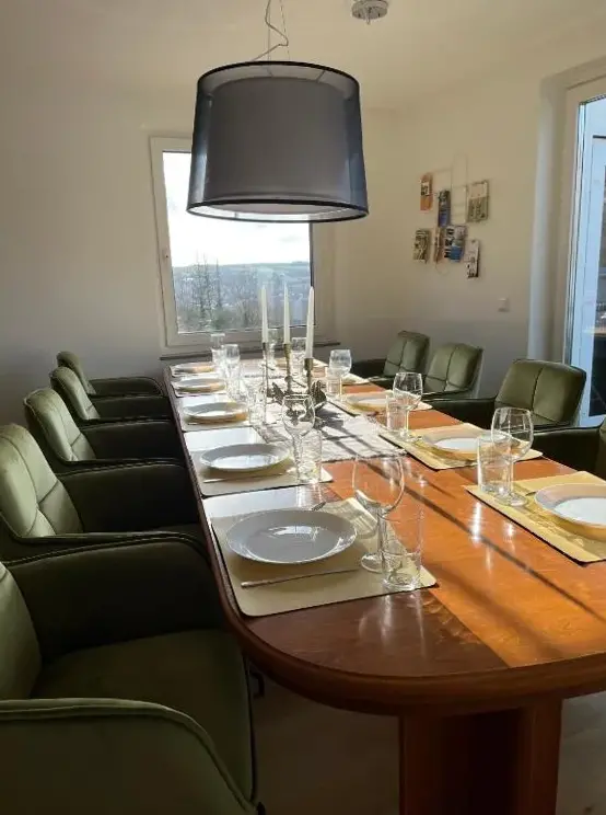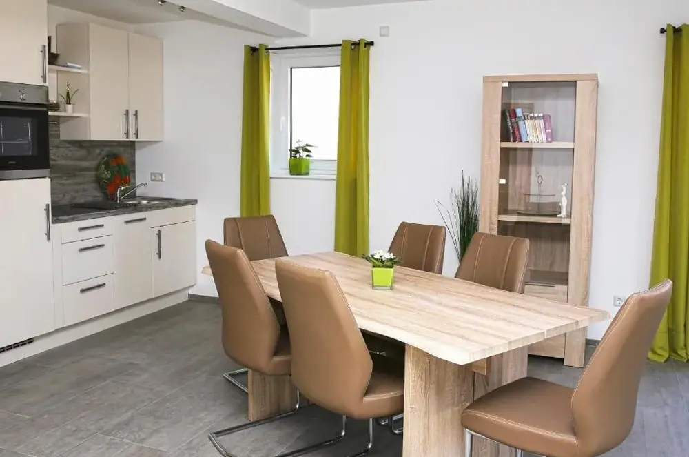 More information about Penthouse perfekt für Teams, Familien und GruppenJakobshof-Lehr in Bad Mergentheim offers a highly rated ground-floor apartment with a terrace and balcony overlooking a garden, providing comfortable room amenities, free WiFi, a kitchenette with a coffee machine, a private bathroom with a walk-in shower, a dining area, TV, and tiled floors.