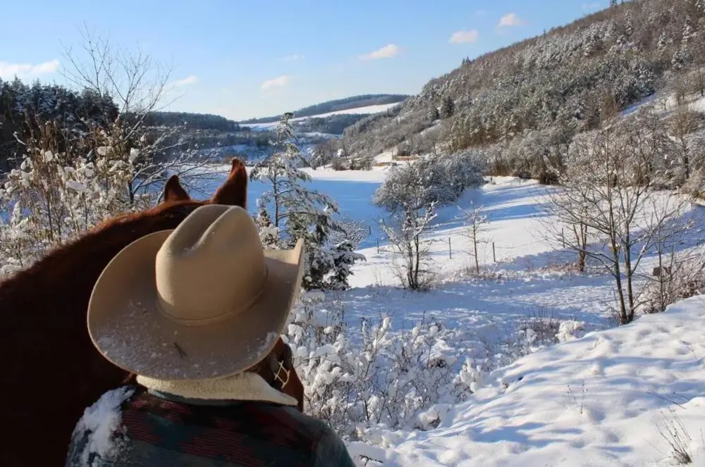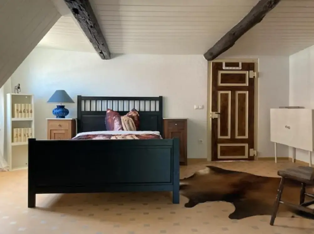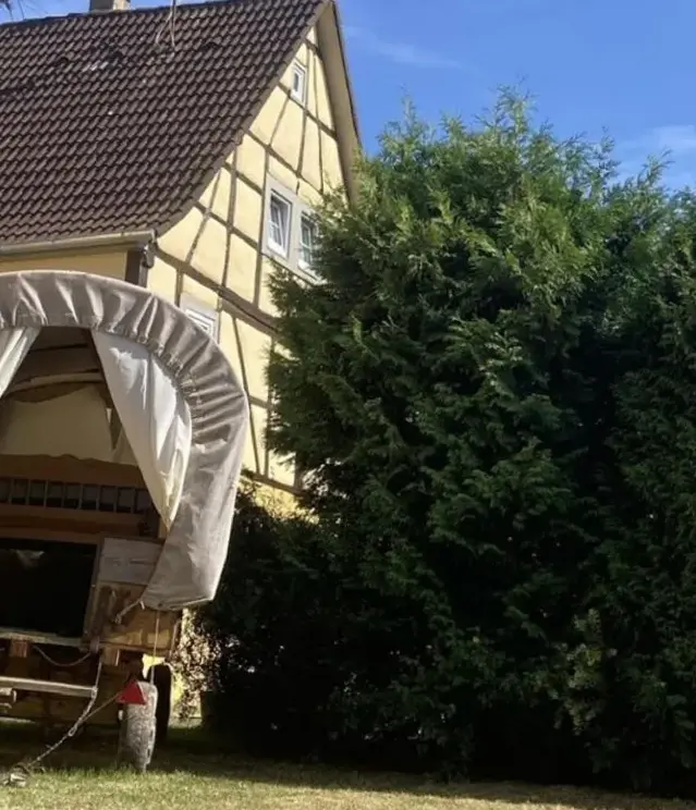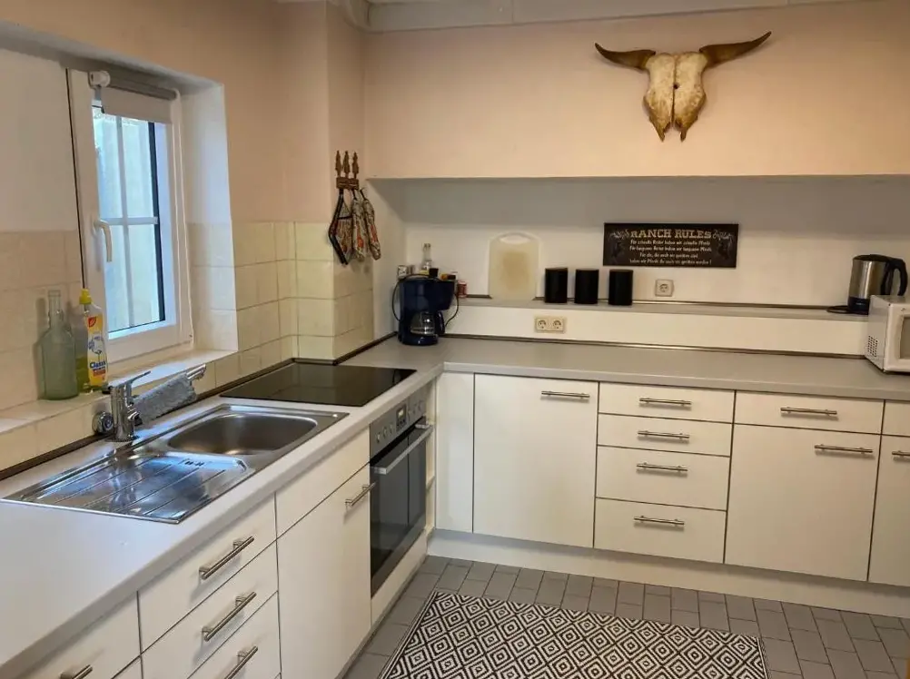 More information about Ferienwohnung DorfperleHaus Vaquero - Rancho el Rosal in Bad Mergentheim offers three bedrooms and a living room, with a fully equipped kitchen, washing machine, and free WiFi. Outdoor spaces include a garden and a terrace with an outdoor fireplace and seating area, plus a barbecue and picnic area for relaxing outdoors.