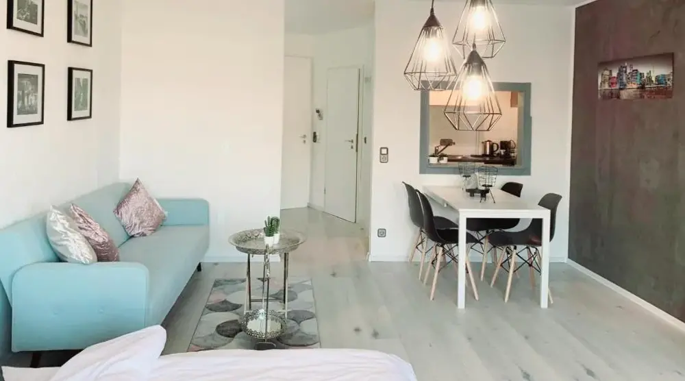 More information about Quadrate Hostel Mannheim Z6 Denkmalschutz✪ Beautiful Studio in Center with Amazing View ✪ is a modern studio in Mannheim offering a terrace with river views, free WiFi, and a fully equipped kitchenette. Guests enjoy a balcony, washing machine, and a comfortable living room with a sofa bed.