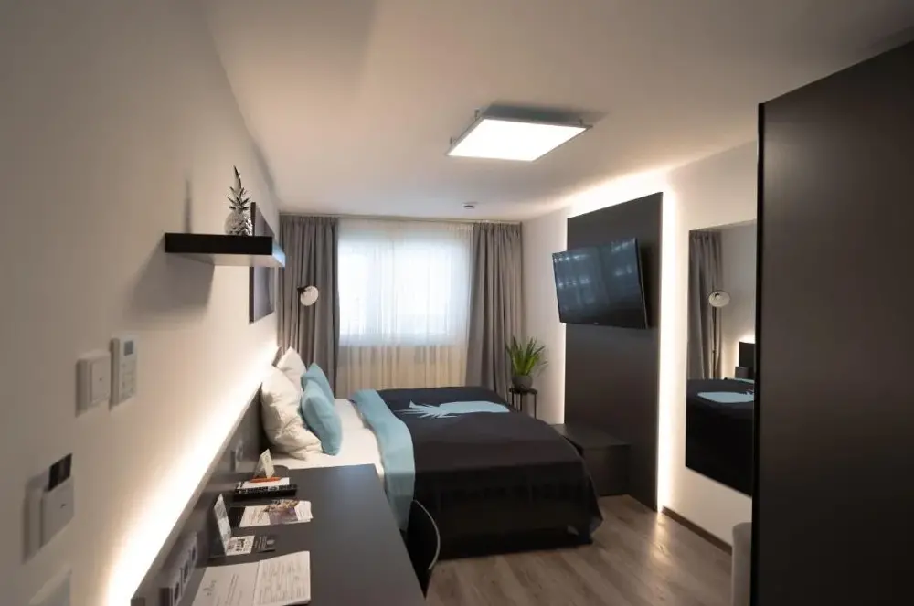 More information about Hotel am HafenWork & Sleep Boardinghouse Mannheim offers adults-only rooms with private bathrooms, air-conditioning, and city views. Each room features a work desk, TV, and soundproofing for a restful stay, while guests enjoy free WiFi, a sun terrace, outdoor seating, a lounge, elevator access, housekeeping, bicycle parking, and free on-site private parking.