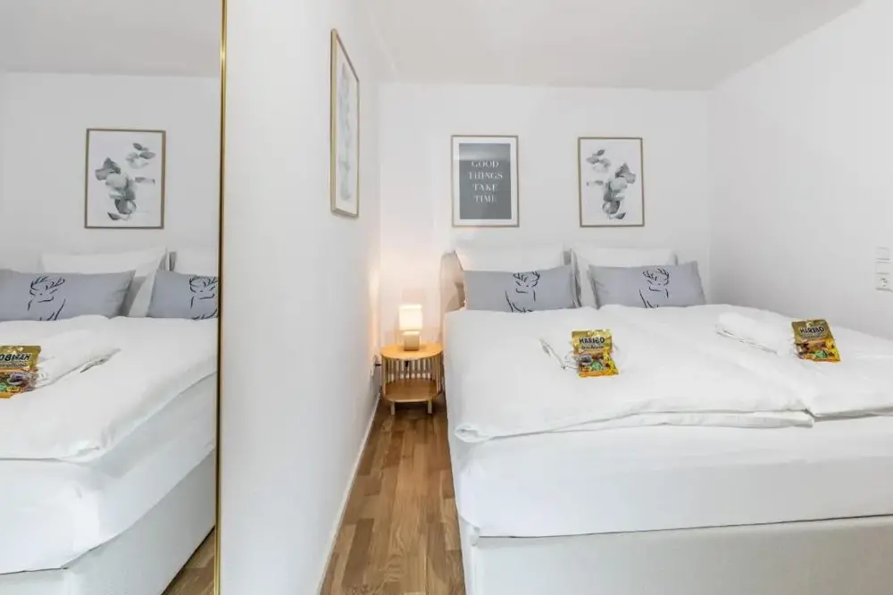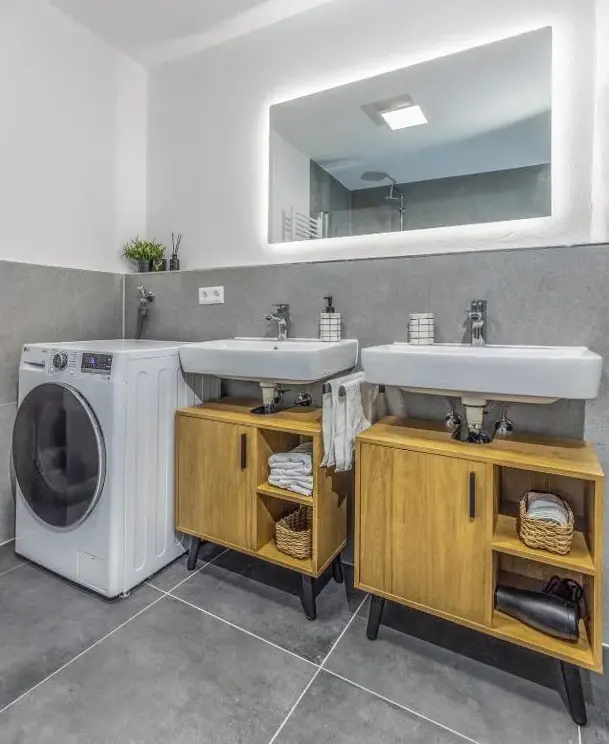 Mais Informações sobre Die Grüne Bettlad Boutique-HotelHochkopf Suite - Premium Apartment - Schwarzwald oferece um apartamento espaçoso e recentemente renovado em Bühl, com dois quartos e uma sala, vistas para as montanhas e uma kitchenette com máquina de café, máquina de lavar e máquina de lavar louça.